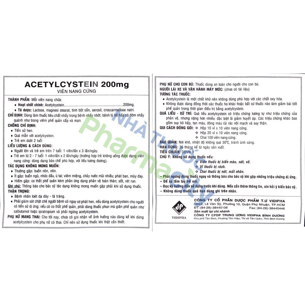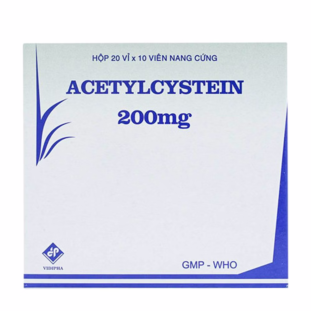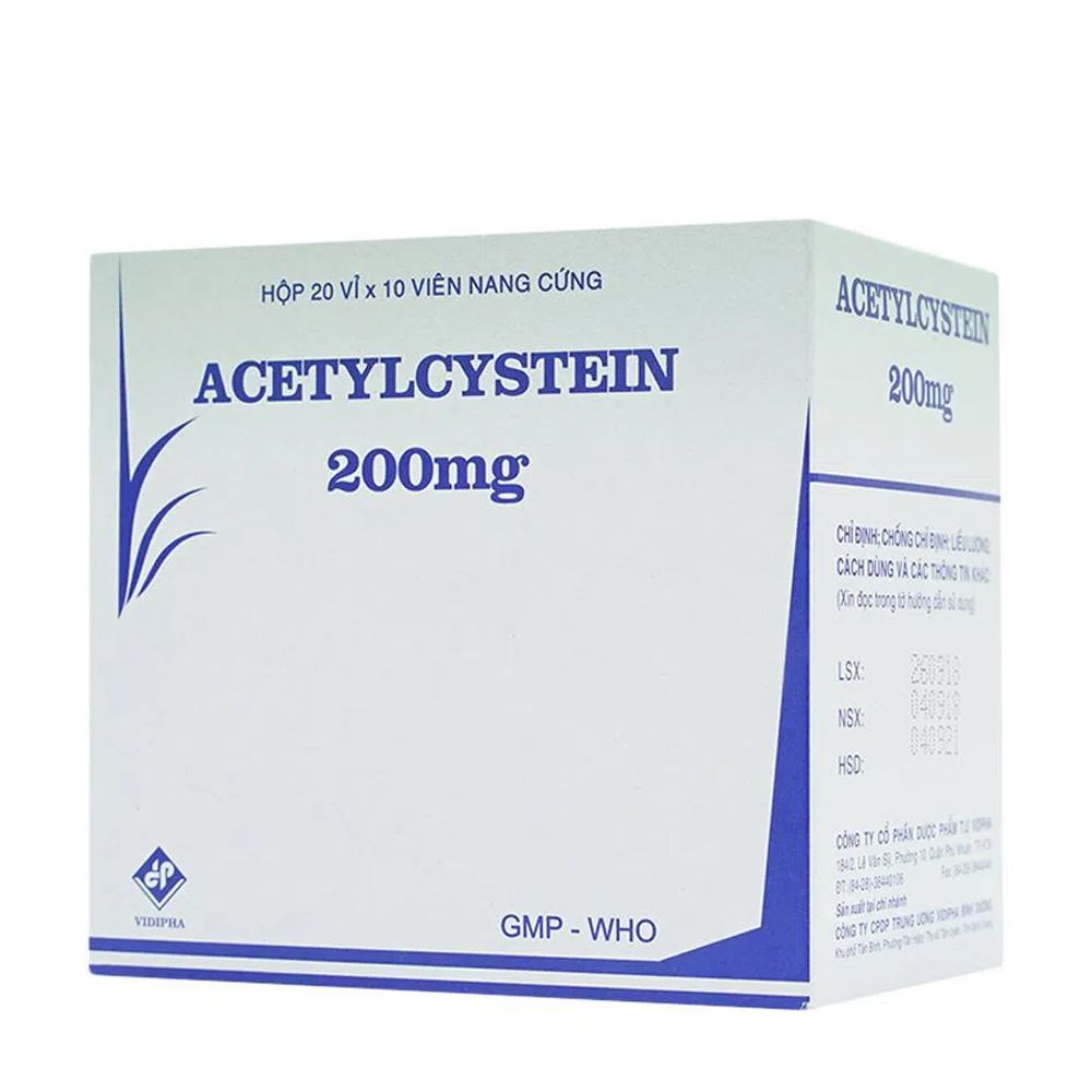 Acetylcystein 200 mg là thuốc được sản xuất bởi Công ty Cổ phần Dược phẩm Trung ương Vidipha. Thuốc chứa thành phần chính là acetylcystein và được sử dụng để tiêu nhầy trong các bệnh lý hô hấp có đờm nhầy quánh, như viêm phế quản cấp và mạn tính, cũng như làm sạch thường quy trong mở khí quản.