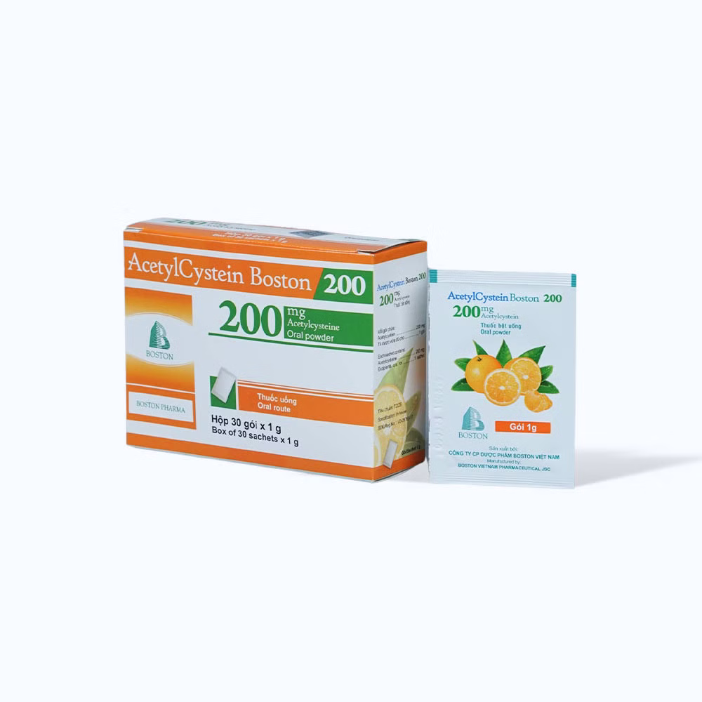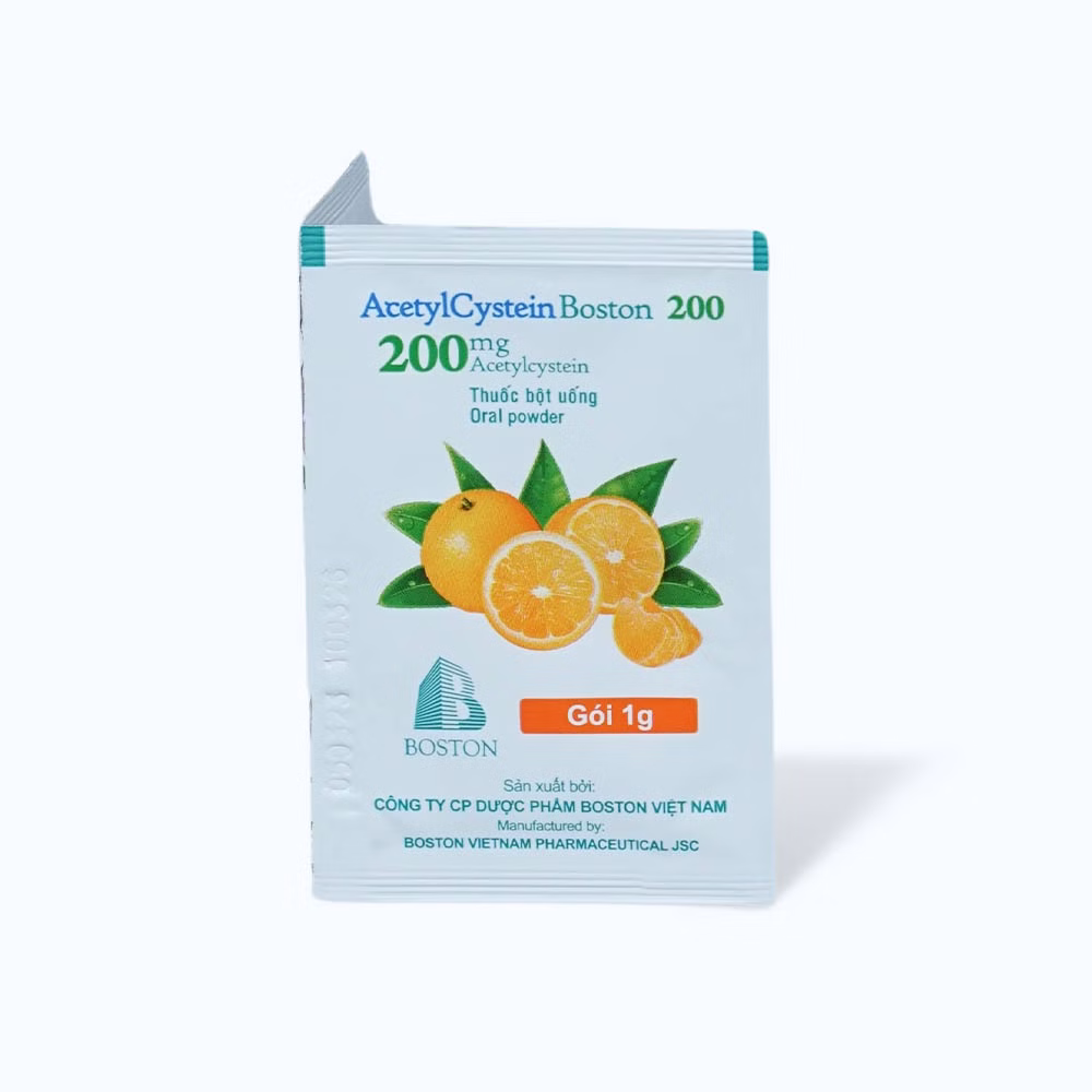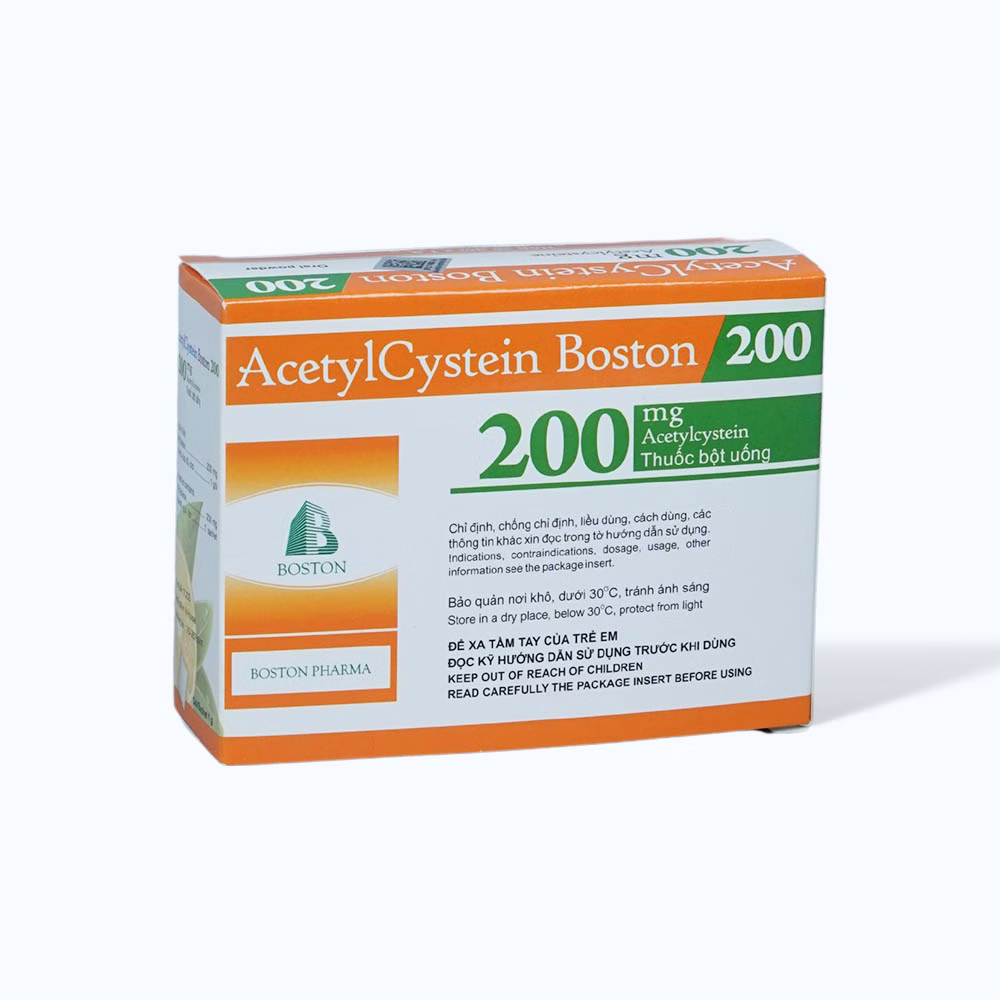 Thuốc bột uống Acetylcystein Boston 200mglà một dạng thuốc được sử dụng để điều trị các bệnh lý đường hô hấp như viêm phế quản mãn tính (COPD), bệnh viêm phế quản mãn tính (CBP), và các bệnh đường hô hấp khác có mủ nhờ tác dụng làm loãng và làm dịu dịch nhầy trong đường hô hấp.