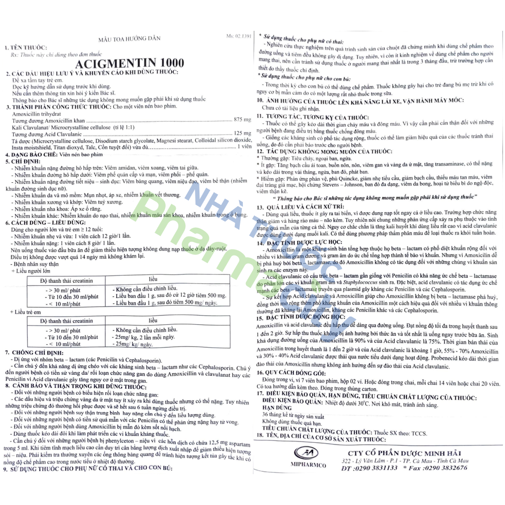 Acigmentin 1000 là thuốc kháng sinh thuộc nhóm beta-lactam, kết hợp giữa Amoxicillin và Acid clavulanic, được sử dụng để điều trị nhiều loại nhiễm khuẩn khác nhau.