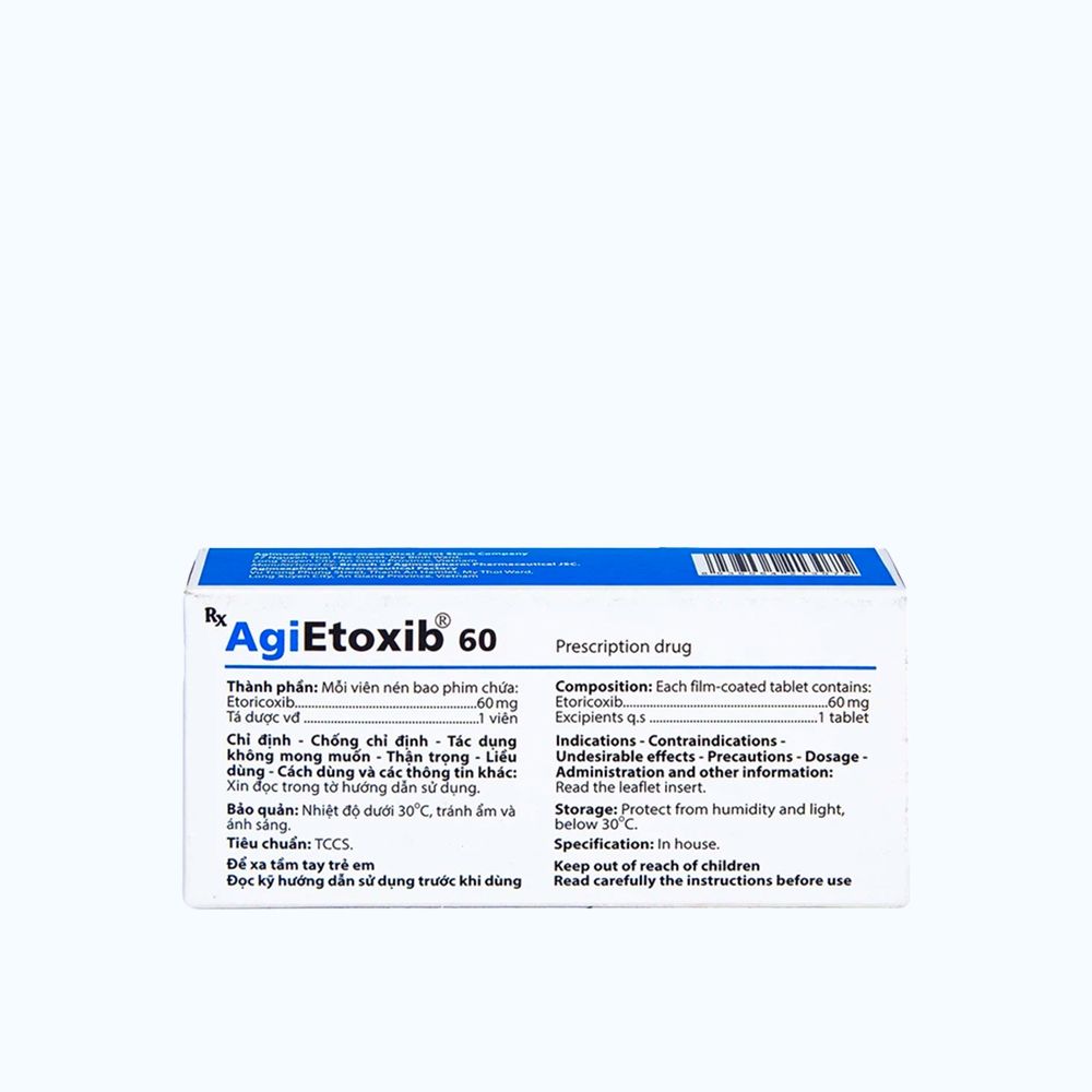 - Sử dụng thận trọng ở Người cao tuổi và những người có nguy cơ cao mắc biến chứng đường tiêu hóa với NSAID. Bệnh nhân đang sử dụng đồng thời một NSAID khác hoặc acid acetylsalicylic khi dùng thuốc Agietoxib 60 cũng cần đặc biệt chú ý.