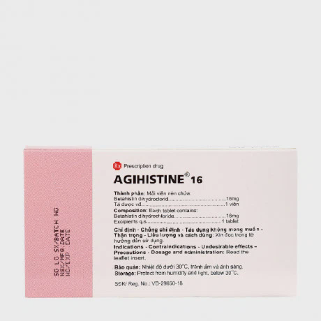 AGIHISTINE 16 là thuốc được sử dụng để điều trị các triệu chứng của rối loạn tiền đình, bao gồm chóng mặt, ù tai, và giảm thính lực liên quan đến bệnh Ménière.