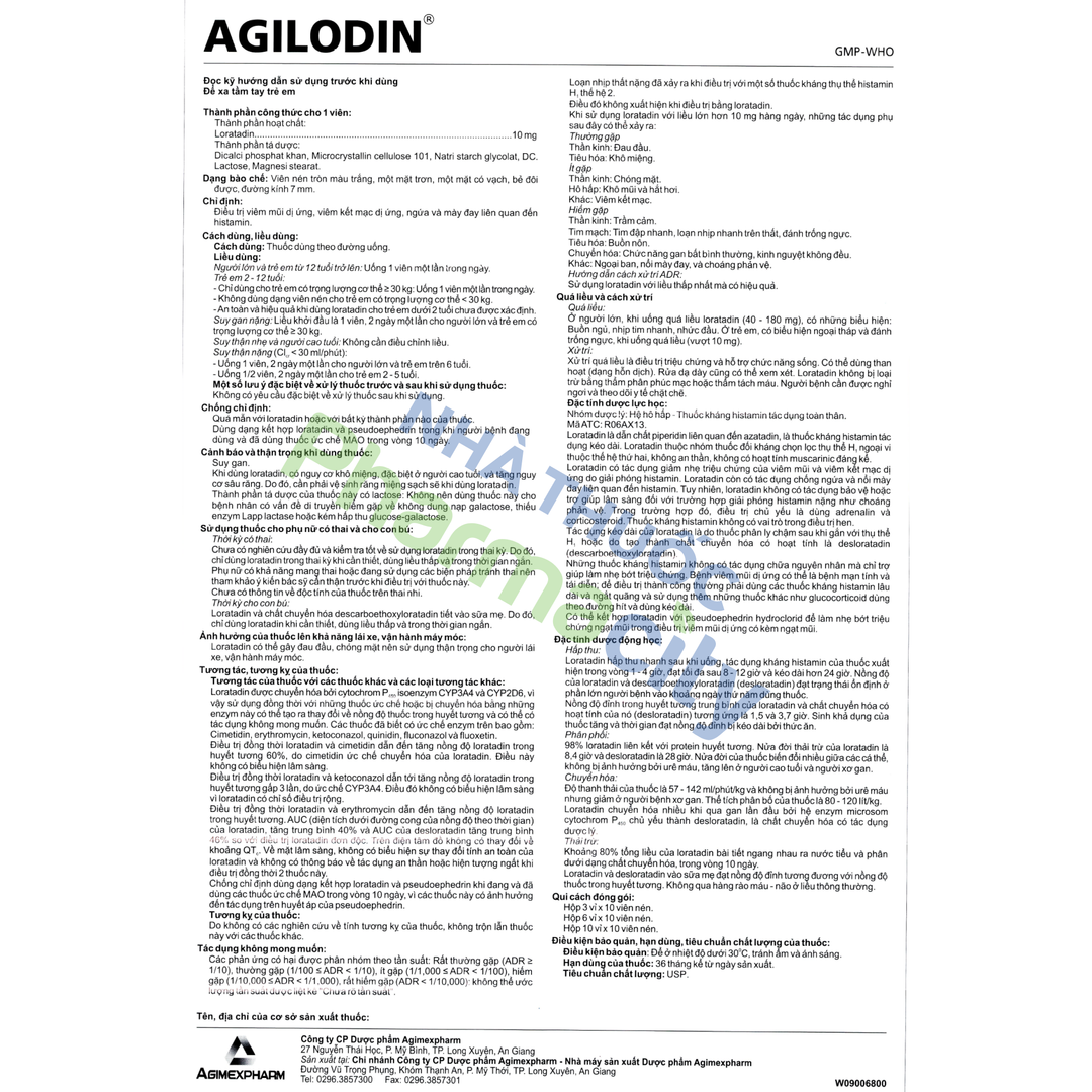 Agilodin 10mg là thuốc chứa hoạt chất loratadine, một loại thuốc kháng histamine được sử dụng để điều trị các triệu chứng dị ứng như viêm mũi dị ứng, mày đay và ngứa.