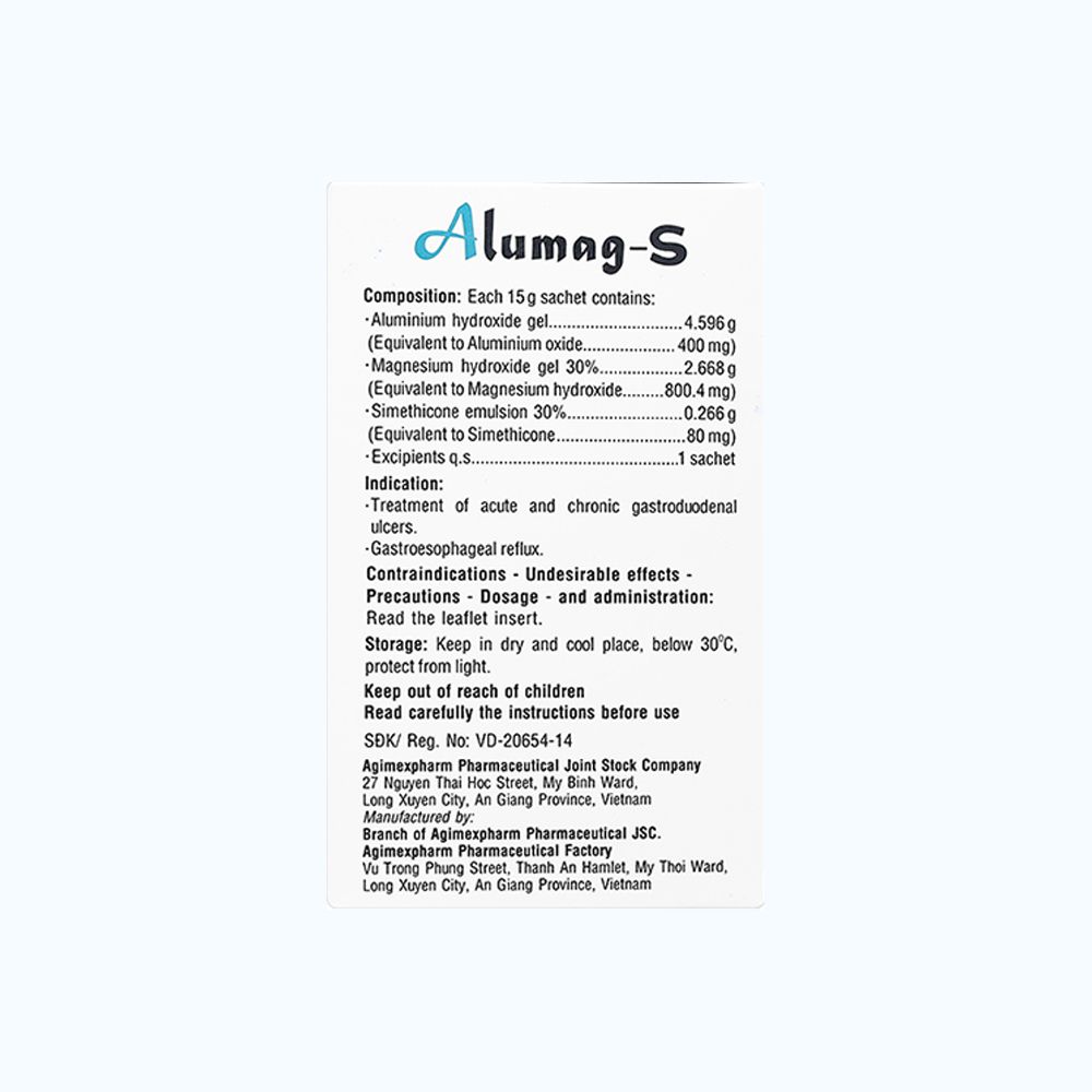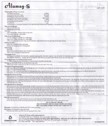Thuốc ALUMAG-S có hoạt chất chính bao gồm: Gel Nhôm hydroxyd, Gel Magnesi hydroxyd, Simethicon. Thuộc nhóm thuốc đường tiêu hóa, chỉ định điều trị trong các trường hợp: Viêm loét dạ dày – tá tràng cấp và mạn tính, trào ngược dạ dày – thực quản. Alumag – S là sản phẩm được sản xuất từ Công ty Cổ phần Dược phẩm Agimexpharm.