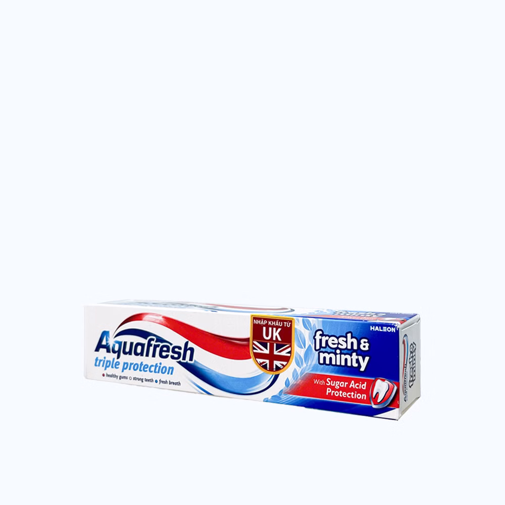 Kem đánh răng Aquafresh KDR Bac Ha Fresh & Minty 100ml là một sản phẩm chăm sóc răng miệng, giúp làm sạch răng, bảo vệ chống sâu răng, và mang lại hơi thở thơm mát. Sản phẩm này được ưa chuộng nhờ vào sự kết hợp của bạc hà tươi mát và công nghệ bảo vệ men răng. Kem đánh răng Aquafresh được sản xuất với công thức ba tác động, bao gồm bảo vệ chống sâu răng, bảo vệ nướu, và giữ cho hơi thở thơm mát suốt cả ngày. Sản phẩm thích hợp cho cả gia đình và giúp duy trì sức khỏe răng miệng tối ưu.