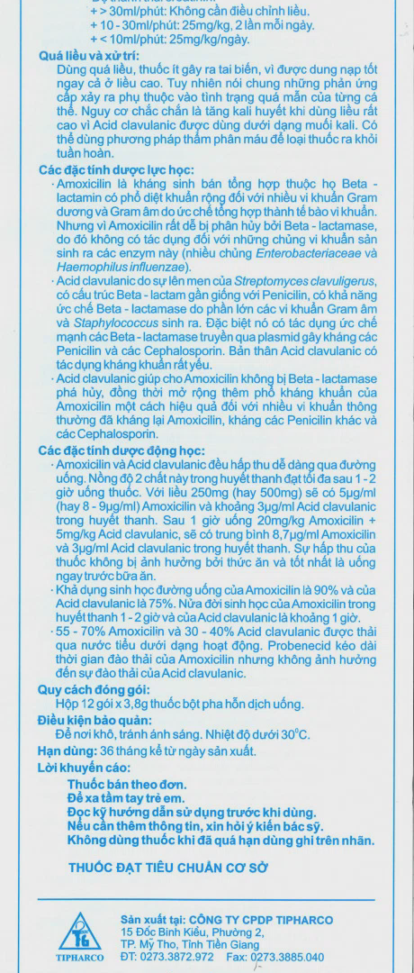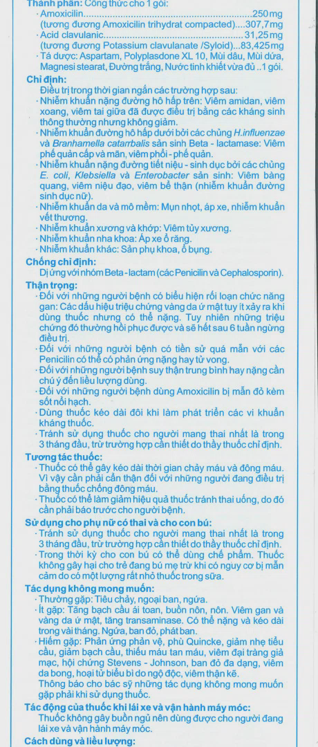 (tương đương Potassium clavulanate/Syloid) 83,425mg - Tá dược: Aspartam, Polyplasdone XL 10, Mùi dâu, Mùi dứa, Magnesi stearat, Đường trắng, Nước tinh khiết vừa đủ….1 gói.