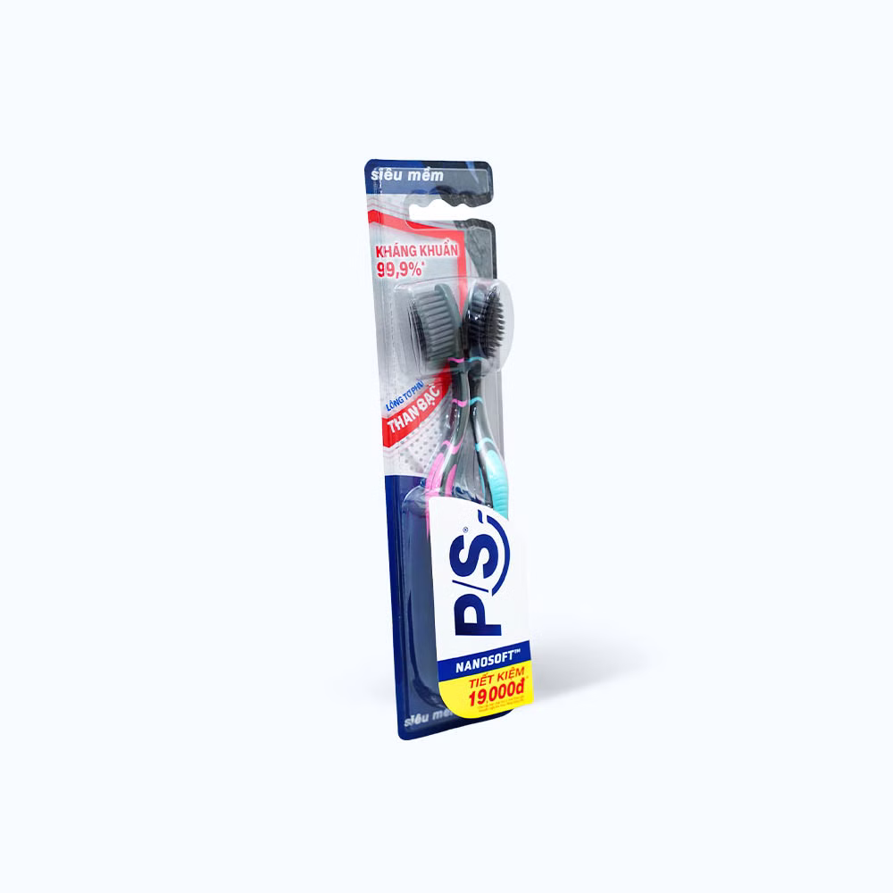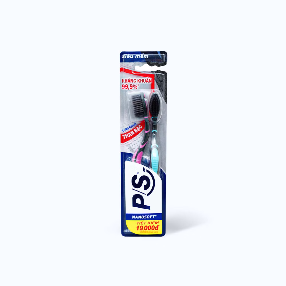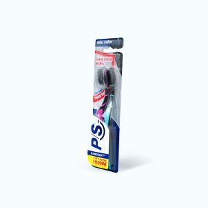 Bộ 2 bàn chải đánh răng P/S than bạc kháng khuẩn 99,9%là dòng sản phẩm cao cấp thế hệ mới của P/S hội tụ đầy đủ các tính năng vượt trội của một bàn chải với thiết kế cổ 3 ngấn độc đáo, mặt chải lưỡi bằng nhựa dẻo mềm mại và đặc biệt lông bàn chải được bổ sung than hoạt tính và ion Bạc + giúp kháng khuẩn đến 99,9%. Đầu lông siêu mảnh 0.01mm giúp nhẹ nhàng loại bỏ mảng bám từ các kẽ răng giúp đánh bóng về mặt răng, giảm mảng bám ố vàng, cho răng trắng bóng.