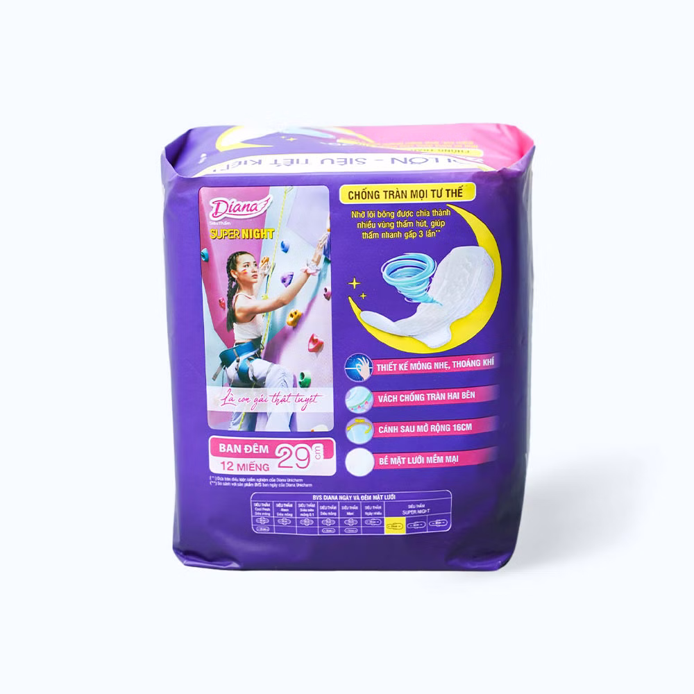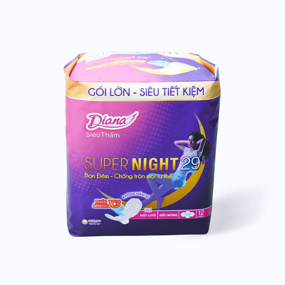 Băng vệ sinh ban đêm Diana Siêu Thấm Super Night 29cm với vách chống tràn độc quyền từ Unicharm Nhật Bản, tăng khả năng thấm hút tốt, bảo vệ tối đa, linh hoạt ôm khít theo từng chuyển động cơ thể để ngăn chất lỏng tràn đa chiều, nâng niu phái đẹp trong mọi tư thế ngủ. Sản phẩm được kiểm soát chất lượng nghiêm ngặt để đáp ứng tiêu chuẩn của Unicharm Nhật Bản.