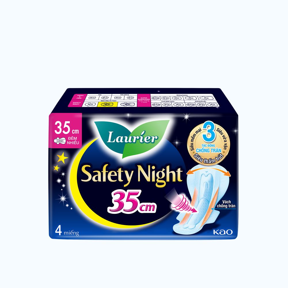 Laurier Safety Night 35cm cho nàng khi ‘’đến tháng’’, giúp phái đẹp giảm lo lắng vì sợ tràn băng, ngủ ngon hơn suốt đêm và thức dậy tràn đầy năng lượng. Thiết kế Flexi Fit với cấu trúc lõi 3D giúp ôm khít cơ thể; công nghệ lõi thấm Block Core có khả năng thấm nhiều hơn 1.4 lần và thấm nhanh vượt trội, giúp da luôn khô thoáng; cùng bề mặt chất liệu từ sợi bông mềm mại, êm dịu với làn da nhạy cảm.