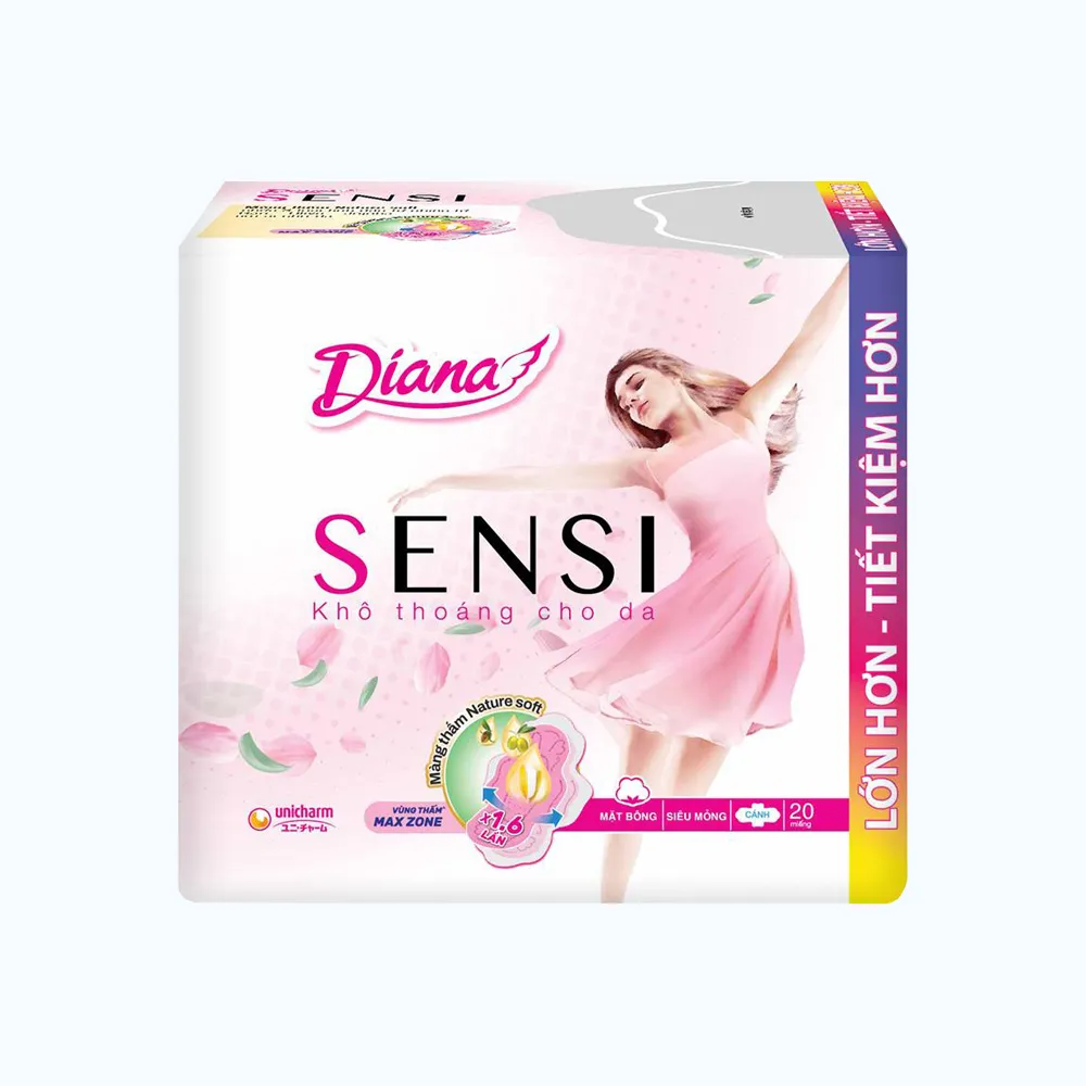Băng vệ sinh hãng Diana là thương hiệu hàng đầu giúp chăm sóc vệ sinh cá nhân cho chị em phụ nữ. Băng vệ sinh Diana Sensi kháng khuẩn siêu mỏng cánhthiết kế với bề mặt vi sợi siêu thấm hút cho da luôn khô thoáng giúp các bạn nữ không bị tràn băng