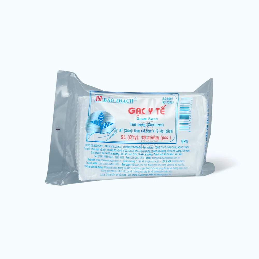 Gạc y tế tiệt trùng BẢO THẠCH lau vết thương nhỏ, thấm máu 5cm x 6,5cm x 12 lớp (10 miếng)
