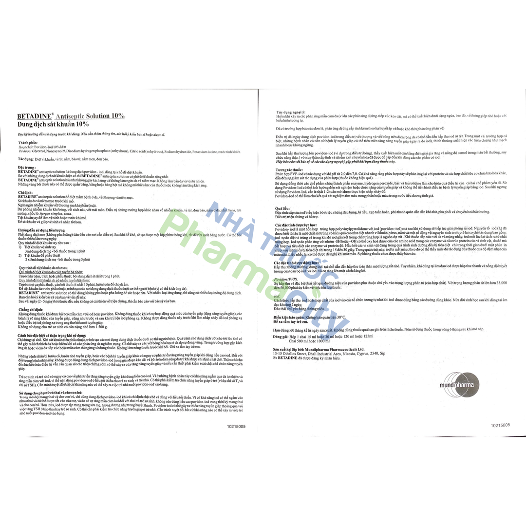 Betadine Antiseptic Solution 10% là một dung dịch sát khuẩn được sử dụng để diệt khuẩn trên da và niêm mạc. Sản phẩm này chứa hoạt chất chính là Povidone-iod, một hợp chất iodine có khả năng diệt vi khuẩn, virus, nấm và một số động vật nguyên sinh. Dung dịch Betadine được sử dụng phổ biến để vệ sinh và sát khuẩn trước các can thiệp phẫu thuật, cũng như điều trị các vết thương, bỏng, và các tình trạng nhiễm khuẩn khác. Sản phẩm có dạng dung dịch và được đóng gói trong chai 125ml, được sản xuất bởi Mundipharma Pharmaceuticals Ltd.
