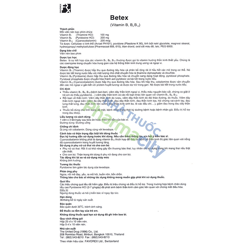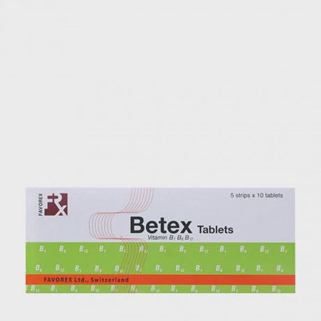 Viên nén Betex là một loại thuốc kết hợp của ba vitamin nhóm B: Vitamin B1 (Thiamine HCl), Vitamin B6 (Pyridoxine HCl), và Vitamin B12 (Cyanocobalamin). Nó thường được sử dụng để hỗ trợ điều trị các rối loạn liên quan đến thiếu hụt vitamin B và các vấn đề về thần kinh.