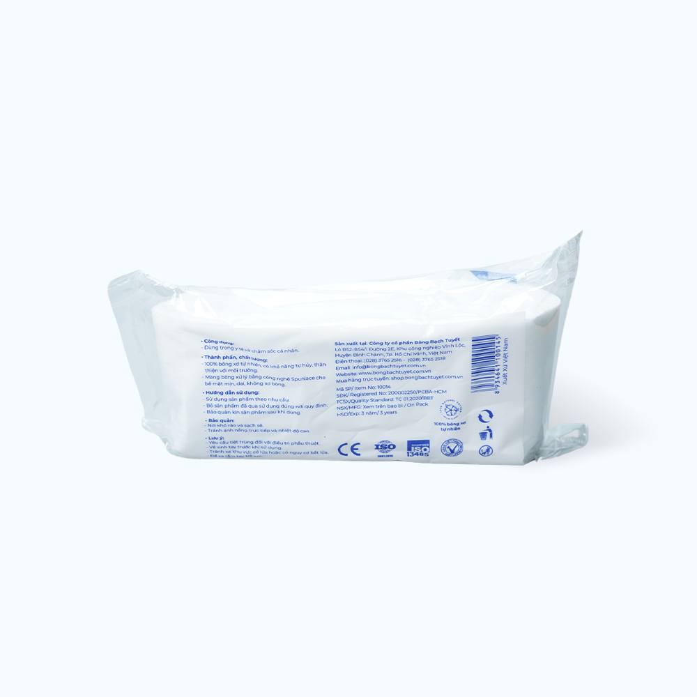 Bông y tế thấm nước Bạch Tuyết được làm từ 100% bông tự nhiên, không tạp chất và không polyester. Sản phẩm được sản xuất với công nghệ xử lý màng bông Spunlace, bông mềm mịn, sạch tinh tế, hạn chế tối đa xơ thừa bám vào bề mặt vết thương.