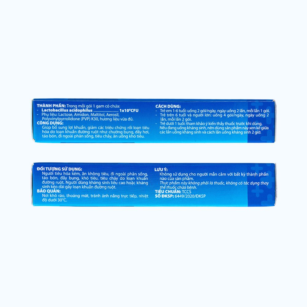 Giúp bổ sung lợi khuẩn, giảm các triệu chứng rối loạn tiêu hóa do loạn khuẩn đường ruột như chướng bụng, đầy hơi, táo bón, đi ngoài phân sống, tiêu chảy, ăn uống khó tiêu.
