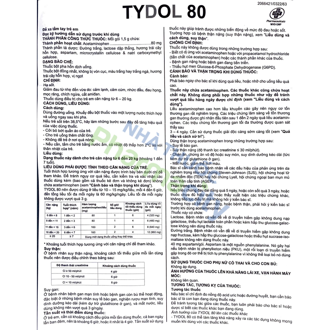 Tydol 80 nên được dùng ở liều từ 10-15mg/kg/liều, mỗi 4 đến 6 giờ