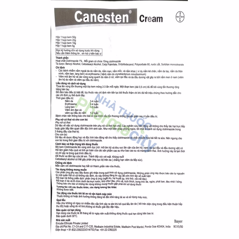 Thuốc bôi ngoài Canesten là một loại kem chống nấm, chứa hoạt chất chính Clotrimazole. Thuốc được sử dụng để điều trị các bệnh nhiễm nấm da như nấm chân, nấm bẹn, nấm thân, lang ben, và nấm móng. Canesten hoạt động bằng cách ức chế sự phát triển của nấm, giúp giảm ngứa, rát và khó chịu do nhiễm nấm. Thuốc được bôi trực tiếp lên vùng da bị nhiễm, thường từ 2-3 lần mỗi ngày theo chỉ dẫn của bác sĩ.