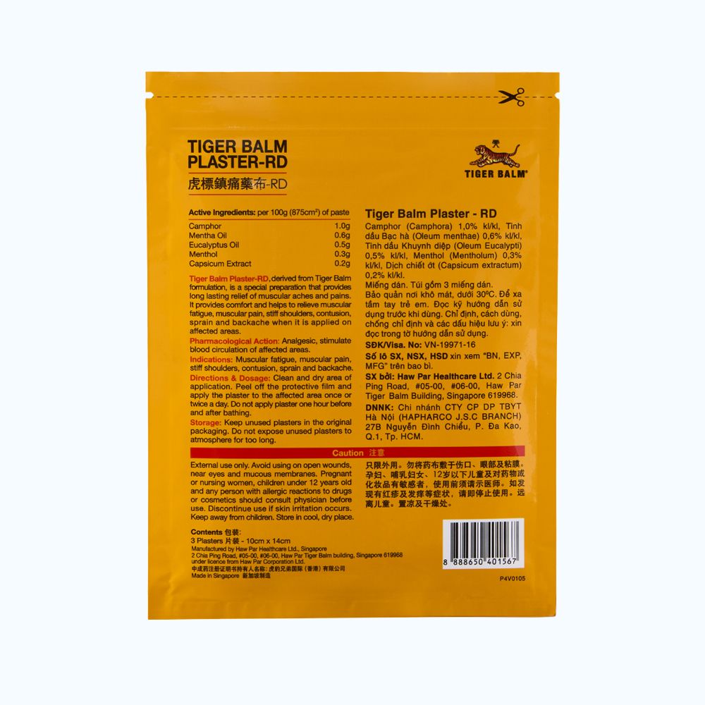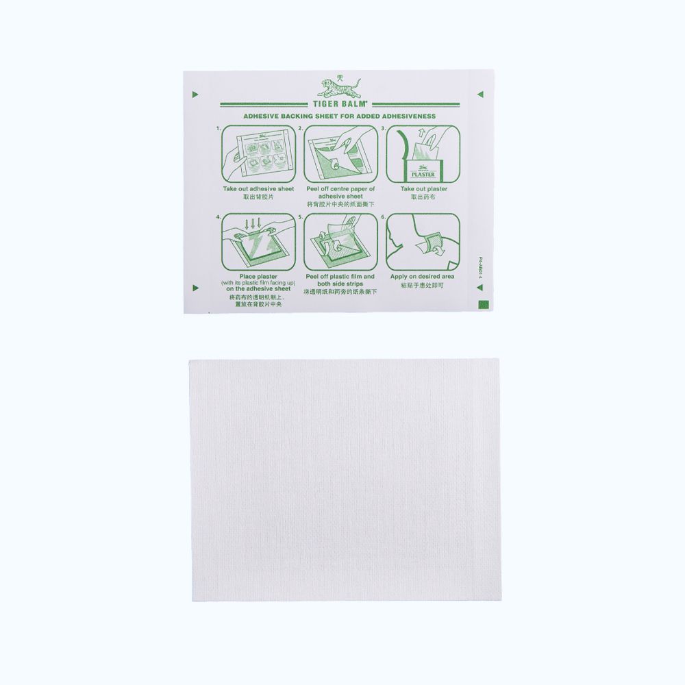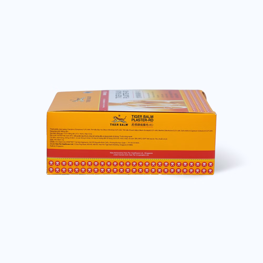 Miếng dán Tiger Balm là sản phẩm của Haw Par Healthcare Limited có thành phần chính gồm Camphor, tinh dầu bạc hà, tinh dầu khuynh diệp, menthol, dịch chiết ớt có công dụng giảm các triệu chứng mỏi cơ, đau và nhức cơ, cứng cổ và vai, vết đụng đập, bong gân và đau lưng.