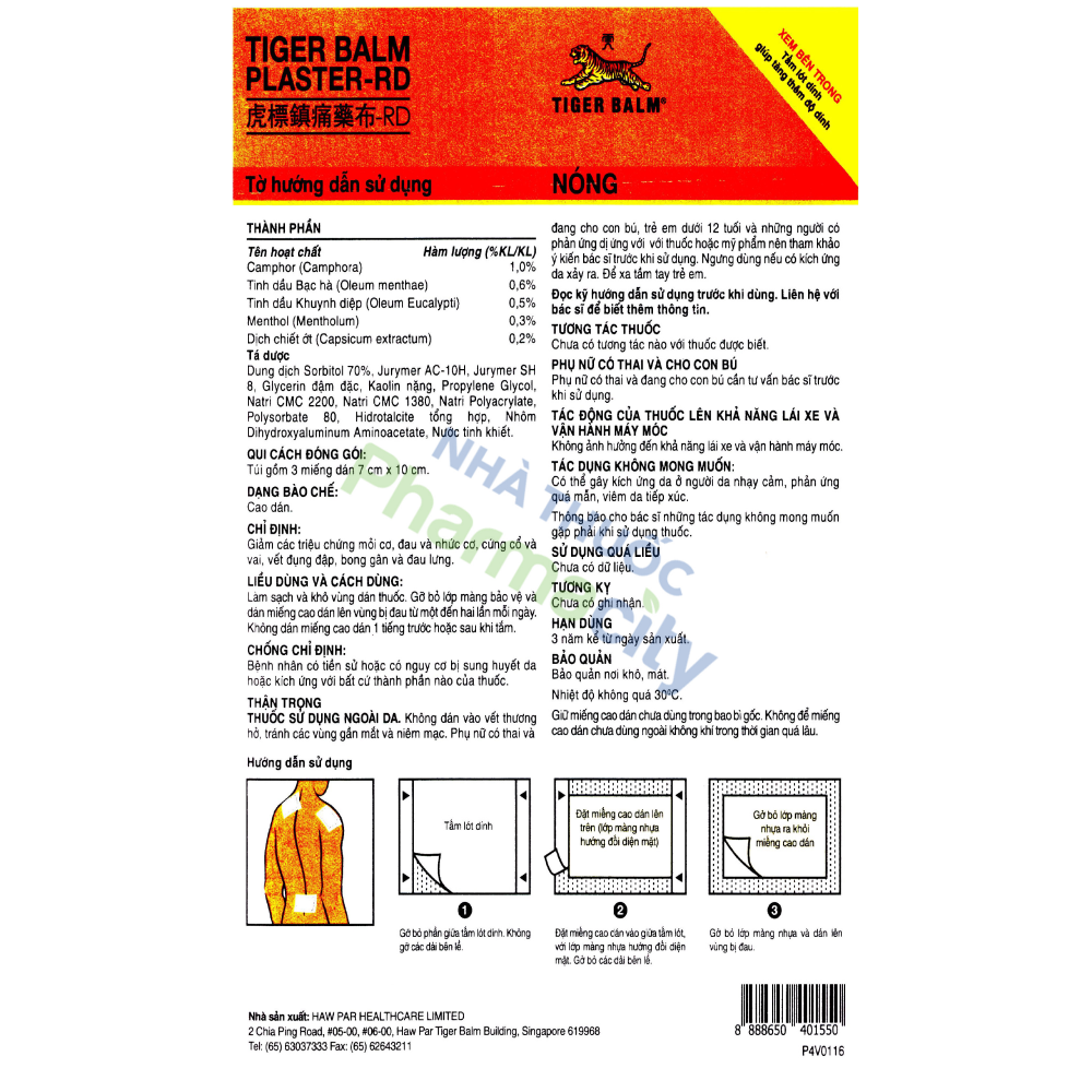Tiger Balm Plaster-RD 7x10cm – Cao dán giảm đau nhức cơ khớp (12 túi x 3 miếng)