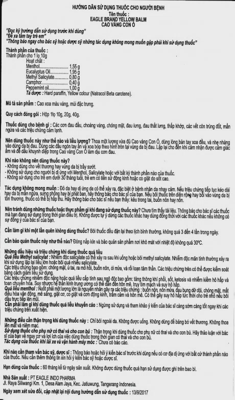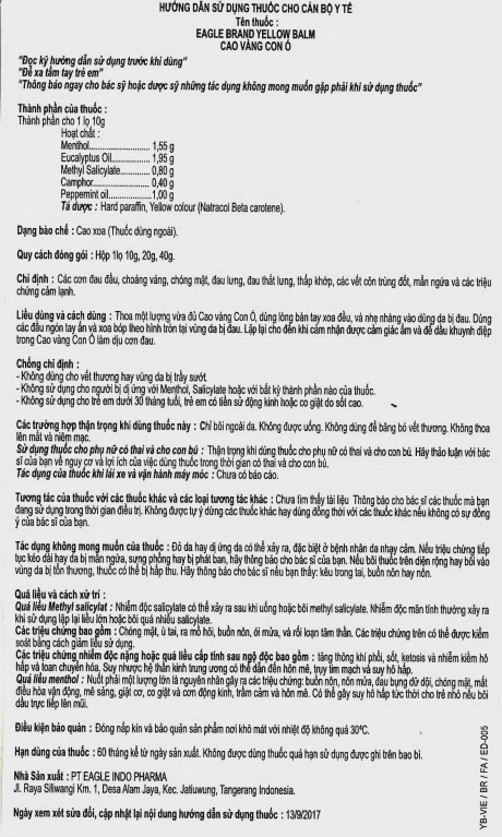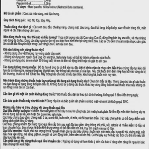 Hoạt chất: Menthol 1.55g, Eucalyptus Oil 1.95g, Methyl Salicylate 0.80g, Camphor 0.40g, Peppermint Oil 1.00g.