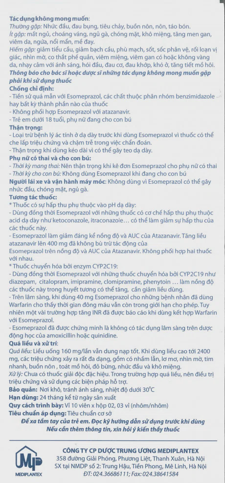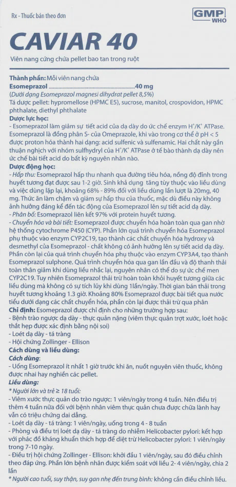 Caviar 40mgMediplantex là thuốc được sử dụng để điều trị các bệnh lý dạ dày và tá tràng như viêm loét dạ dày , viêm loét tá tràng và trào ngược dạ dày thực quản . Thuốc chứa hoạt chấtEsomeprazole, thuộc nhóm ức chế bơm proton (PPI), có tác dụng giảm tiết axit dạ dày, giúp làm giảm các triệu chứng như đau rát, ợ nóng và khó tiêu, đồng thời hỗ trợ quá trình lành vết loét.