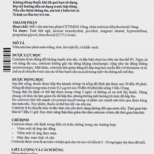 - Hoạt chất: Mỗi viên nén bao phim cetimed chứa 10 mg cetirizin dihydroclorid.