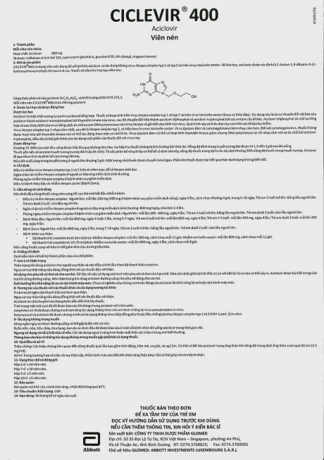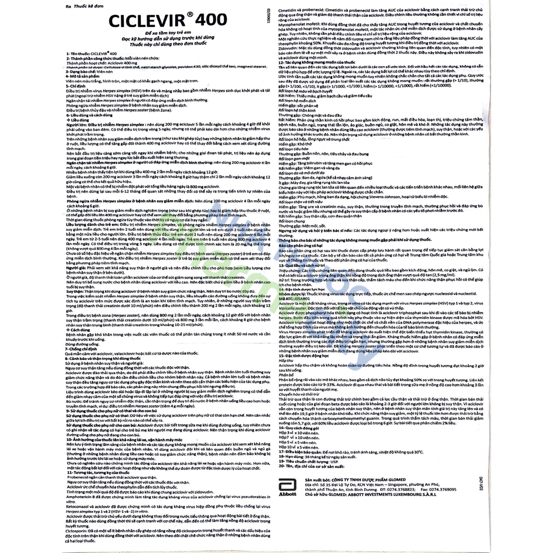Ciclevir 400 là một loại thuốc kháng virus, là sản phẩm của Công ty Cổ phần Dược phẩm Glomed, có thành phần chính là acyclovir. Thuốc được dùng để phòng ngừa, điều trị và ngăn chặn tái nhiễm virus Herpes simplex (HSV) trên da và màng nhầy bao gồm nhiễm Herpes sinh dục khởi phát và tái phát (ngoại trừ nhiễm HSV nặng ở trẻ suy giảm miễn dịch). Ngoài ra, thuốc còn được chỉ định điều trị bệnh thủy đậu và nhiễm Herpes zoster (bệnh Zona).