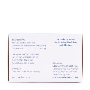 – Dược chất: Ciprofloxacin hydrochloride tương đương Ciprofloxacin 500mg