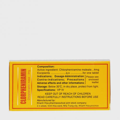 Viên nén Clorpheniramin 4mg là một loại thuốc kháng histamin được sử dụng để giảm các triệu chứng dị ứng như hắt hơi, ngứa, chảy nước mũi, và ngứa mắt hoặc cổ họng. Thuốc này hoạt động bằng cách ngăn chặn tác dụng của histamin, một chất tự nhiên trong cơ thể gây ra các triệu chứng dị ứng.