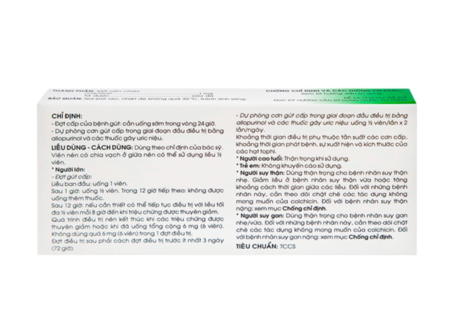 Liều ban đầu là 0,5 – 1,2mg, sau đó cứ cách 1 – 2 giờ lại uống 0,50 – 0,60mg hoặc cứ cách 2 giờ lại uống 1 – 1,2mg cho đến khi hết đau hoặc bị nôn hay tiêu chảy. Tổng liều trung bình Colchicin uống trong một đợt điều trị 4 – 6mg.