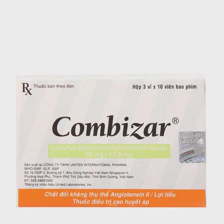 Combizar 50mg/12.5mg là thuốc điều trị cao huyết áp, chứa hai thành phần hoạt chất: Losartan potassium (50mg), giúp giãn mạch máu, và Hydrochlorothiazide (12.5mg), một thuốc lợi tiểu giúp loại bỏ nước và muối thừa. Sự kết hợp này giúp kiểm soát huyết áp hiệu quả và giảm nguy cơ biến chứng tim mạch.