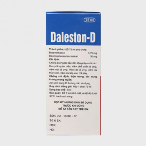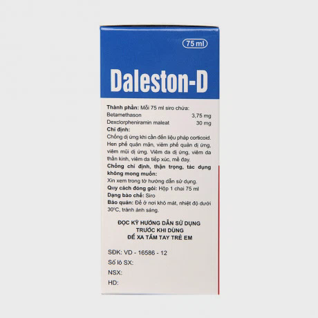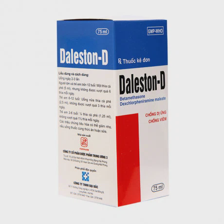 Siro Daleston-D là một loại siro điều trị các triệu chứng dị ứng và các bệnh liên quan đến hệ hô hấp như hen phế quản, viêm phế quản dị ứng, và viêm mũi dị ứng. Sản phẩm kết hợp hai hoạt chất chính là Betamethason và Dexclorpheniramin maleat để giảm viêm và làm giảm các phản ứng dị ứng.