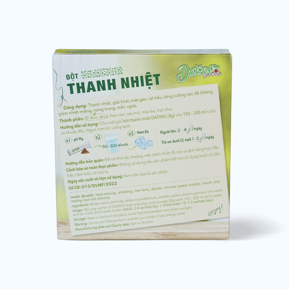 Cho một gói bột nước mát Datino (8g) vào 150-200ml nước và khuấy đều. Ngon hơn khi uống lạnh.