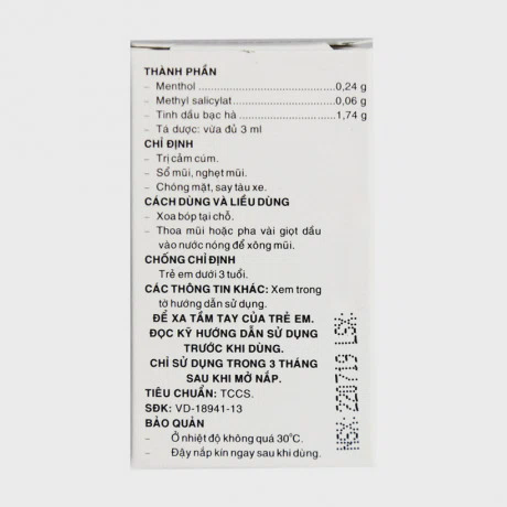 Thành phần hoạt chất: Menthol 8g; Methyl salicylat 2g; Tinh dầu bạc hà 58g.