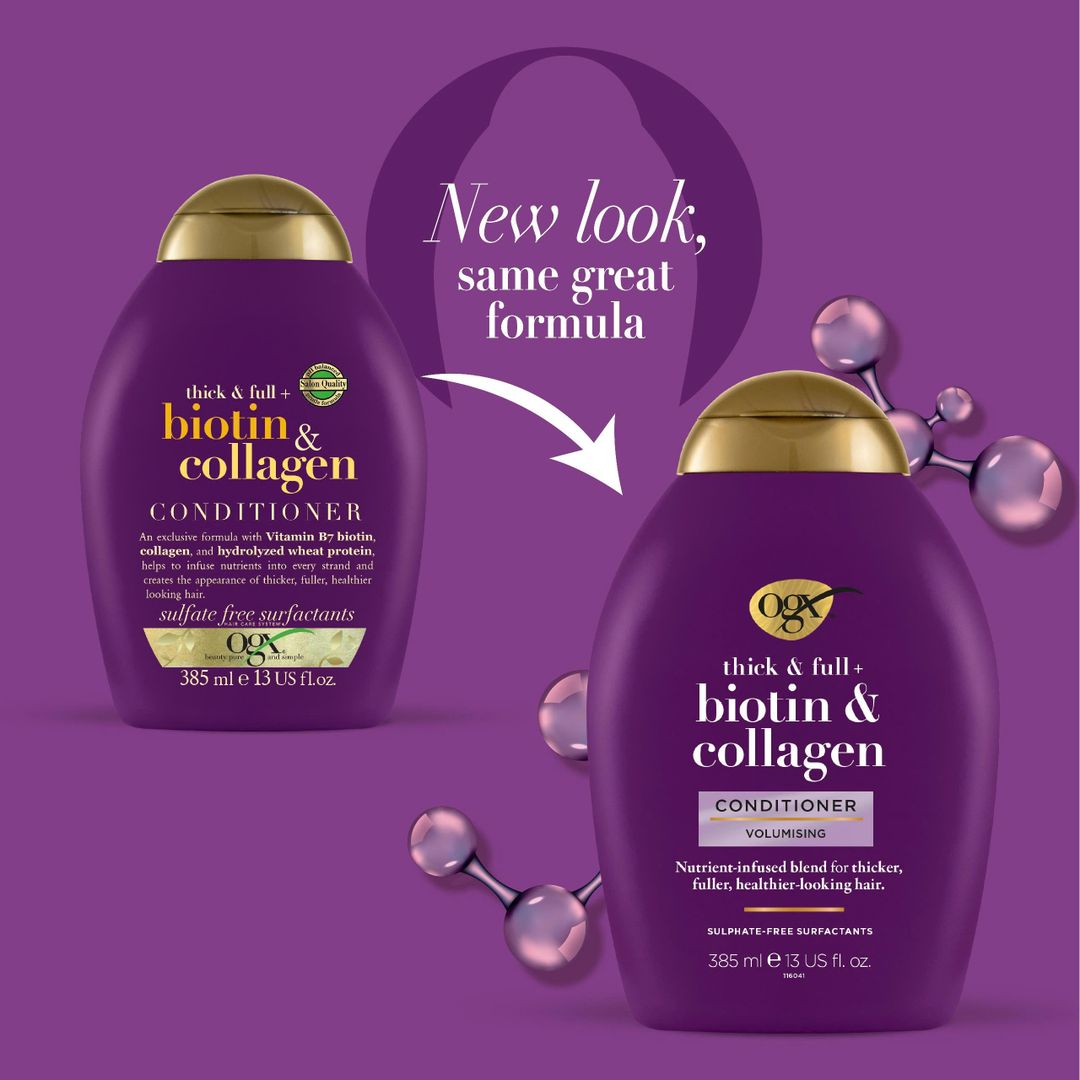 Sản phẩm dầu xả OGX Thick & Full + Biotin & Collagen Conditioner giúp cải thiện tình trạng gãy rụng, nuôi dưỡng tóc từ bên trong, mang đến cho bạn một mái tóc chắc khỏe và bồng bềnh nhờ hai thành phần dưỡng chất tuyệt vời là Biotin và Collagen.