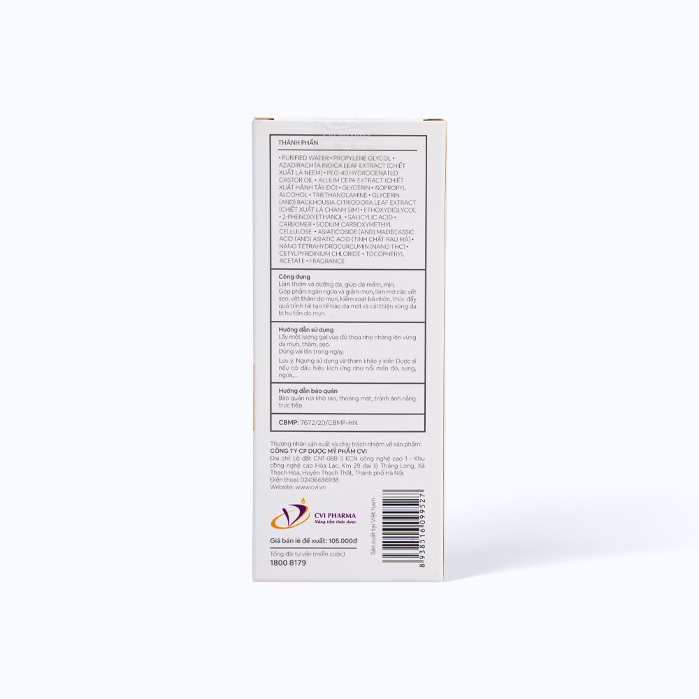 Purified Water, Niacinamide, Glycerin (And) Water (And) Allium Cepa (Onion) Bulb Extract (Chiết Xuất Củ Hanh Tây Đỏ) (And) Sodium Benzoate (And) Potassium Sorbate, Propylene Glycol, Peg-40 Hydrogenated Castor Oil, Triethanolamine, Glycerin (And) Backhousia Citriodora Leaf Extract (Chiết Xuất Là Chanh Sim), Ethoxydiglycol, Carbomer, Water (And) Butylene Glycol (And) Glycerin (And) Melia Azadirachta Leaf Extract (Chiết Xuất Là Neem) (And) 1,2-Hexanediol (And) Ethyl Hexanediol, Tetrahydrocurcumin (Tinh Chất Nghệ Ứng Dụng Công Nghệ Nano), Asiaticoside (And) Madecassic Acid (And) Asiatic Acid, Phenoxyethanol, Salicylic Acid, Zinc PCA, Capryloyl Salicylic Acid, Tocopheryl Acetate, O-Cymen-5-Ol, Curcuma Longa (Turmeric) Oil, Fragrance.