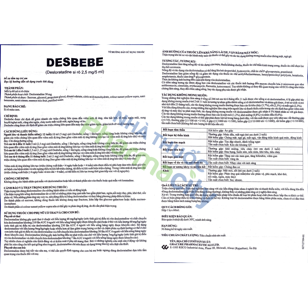 Thành phầnSiro Desbebe 2,5mg/5ml