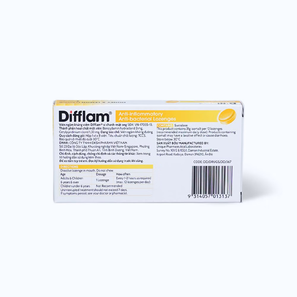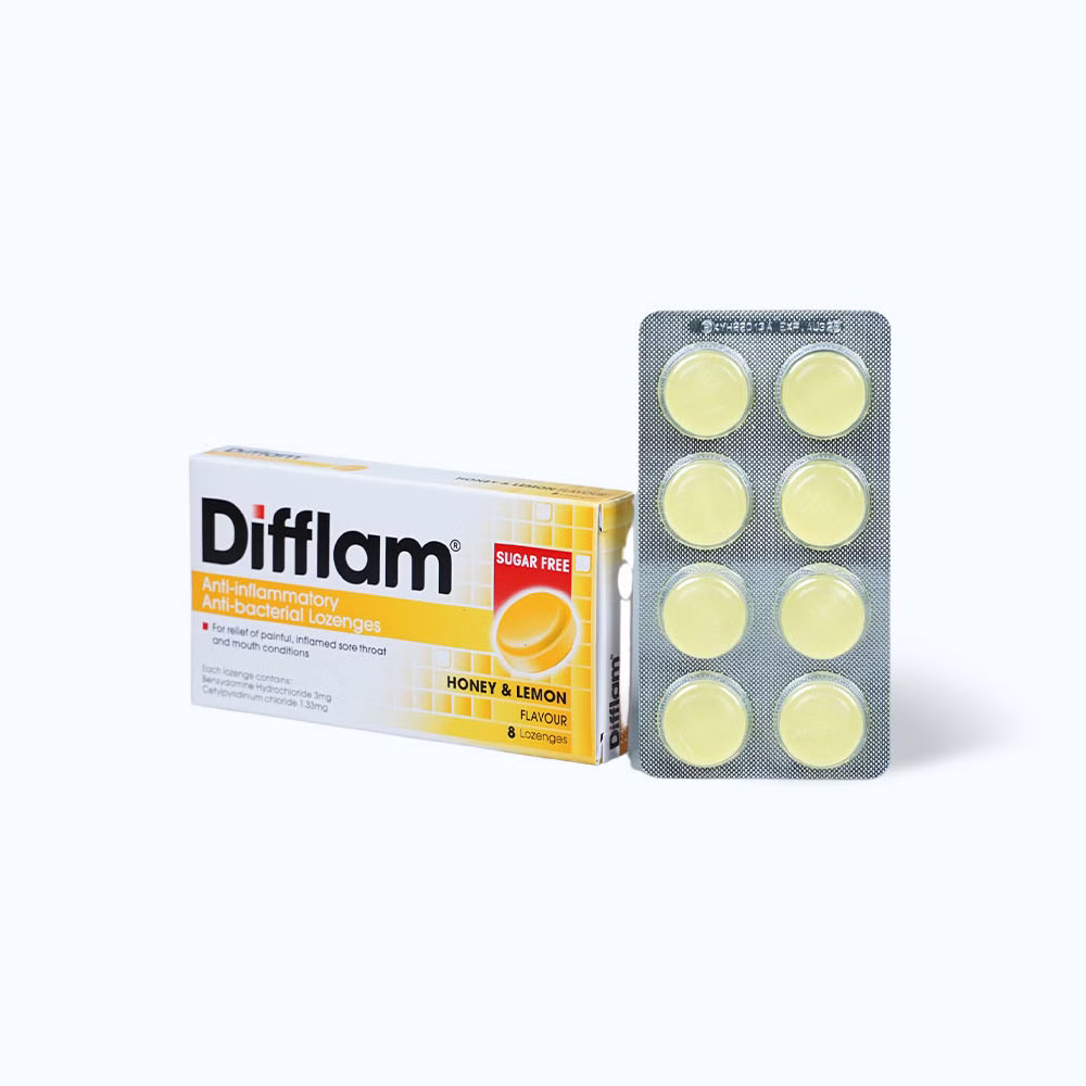 Viên ngậm kháng viêm Difflam vị chanh – mật ong giúp làm giảm tạm thời tình trạng đau ở khoang miệng bao gồm các trường hợp viêm amidan, đau họng, viêm niêm mạc do bức xạ, nhiệt miệng, hậu phẫu miệng và hậu phẫu nha chu, viêm họng, các tình trạng sưng, đỏ và viêm.