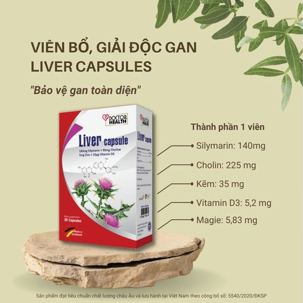 Liver Capsule là sản phẩm hỗ trợ gan hiệu quả từ thương hiệu Doctor Health của Đức. Chứa Silymarin hàm lượng cao giúp hỗ trợ giải độc, hỗ trợ hạ men gan, hỗ trợ tăng cường chức năng gan và bảo vệ gan khỏi các tác nhân gây hại như rượu bia, thuốc lá và thuốc tây. Ngoài ra công thức còn chứa Choline, Vitamin D3 và Kẽm Gluconate hỗ trợ bảo vệ tế bào gan, dùng được cho các trường hợp đang điều trị viêm gan, xơ gan, ung thư gan, đồng thời cải thiện sức khỏe tổng thể. Sản xuất bởi Goerlich Pharma – thương hiệu uy tín với hơn 40 năm kinh nghiệm, đạt chứng nhận lưu hành tự do Châu Âu. Hiệu quả rõ rệt sau 1 tháng sử dụng, nên sử dụng đủ liệu trình 3 tháng để đạt kết quả tối ưu.