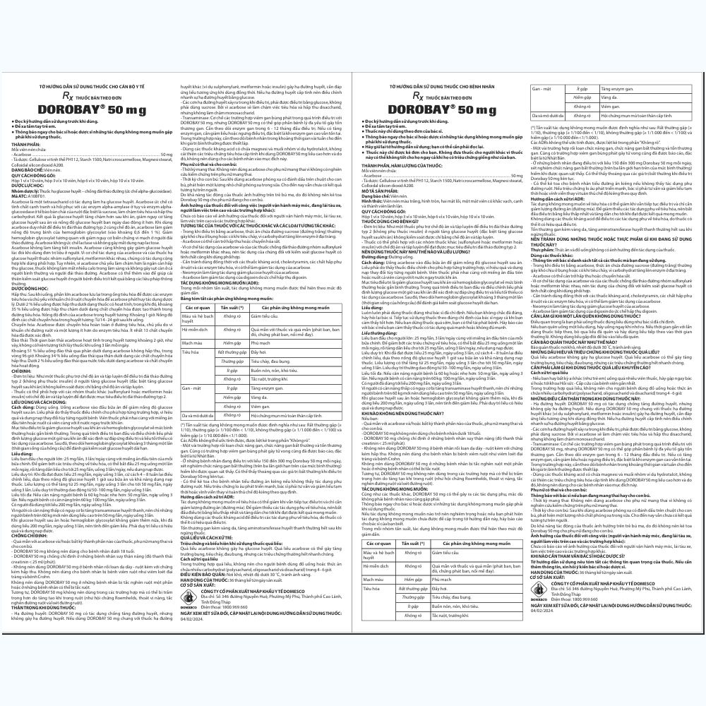 – Dorobay 50mg có tác dụng chống tăng đường huyết, nhưng không gây hạ đường huyết. Tuy nhiên, bệnh nhân có thể bị hạ đường huyết quá mức khi dùng đồng thời Dorobay và các thuốc hạ đường huyết khác (ví dụ: Sulfonylurea, metformin hoặc insulin).