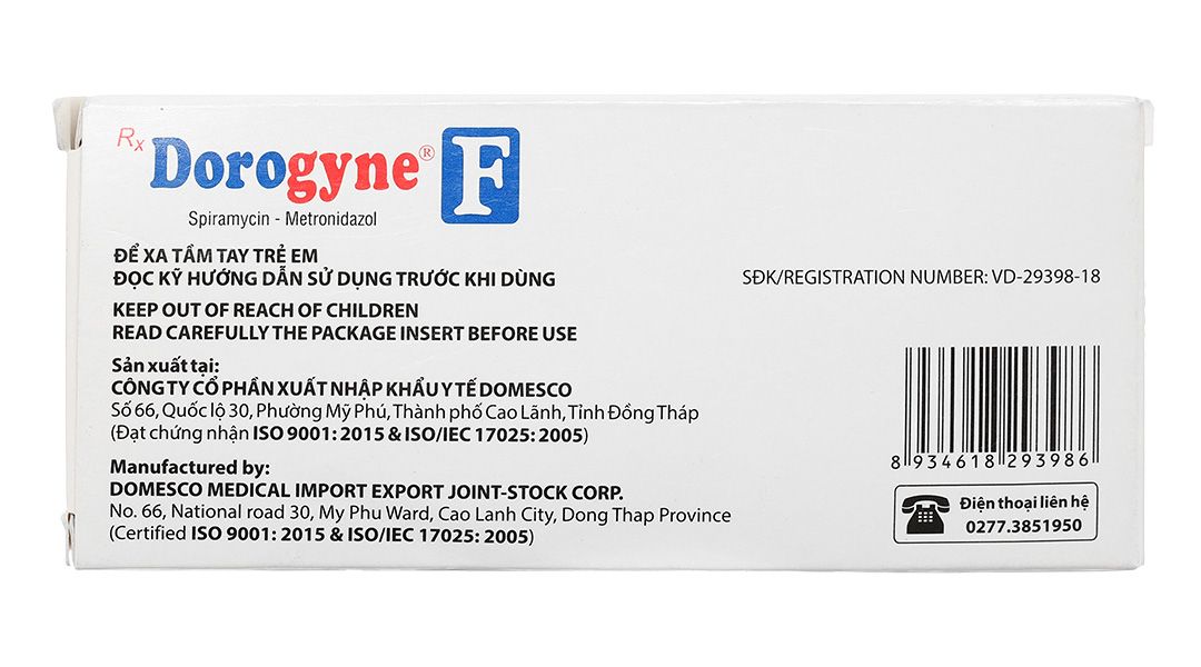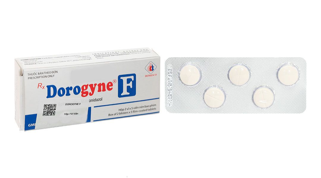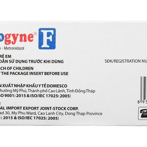 Drogyne F được sản xuất bởi Công ty Cổ phần Xuất nhập khẩu Y tế Domesco, thành phần chính là Spiramycin và metronizazol. Đây là thuốc được chỉ định trong các bệnh nhiễm khuẩn răng miệng cấp, mạn tính hoặc tái phát như áp xe răng, viêm tấy, viêm mô tế bào quanh xương hàm, viêm quanh thân răng, viêm nướu, viêm nha chu, viêm miệng, viêm tuyến mang tai, viêm dưới hàm; phòng các bệnh nhiễm khuẩn răng miệng sau phẫu thuật. Drogyne F được bào chế dưới dạng viên nén bao phim, mỗi viên chứa Spiramycin 1.500.000IU và Metronizazol 250mg.