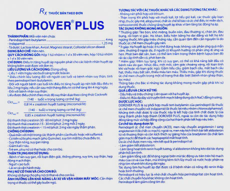 - Dorover Plus là sự phối hợp muối tert-butylamin của perindopril (là thuốc ức chế men chuyển) với indapamid (là thuốc lợi niệu nhóm chlorosulphamoyl). Những tính chất dược lý của thuốc này là kết hợp của tính chất dược lý của từng thành phần hợp thành Dorover Plus, ngoài ra còn do tác dụng hiệp đồng tăng mức và hiệp đồng cộng của hai thành phần kết hợp nêu trên.