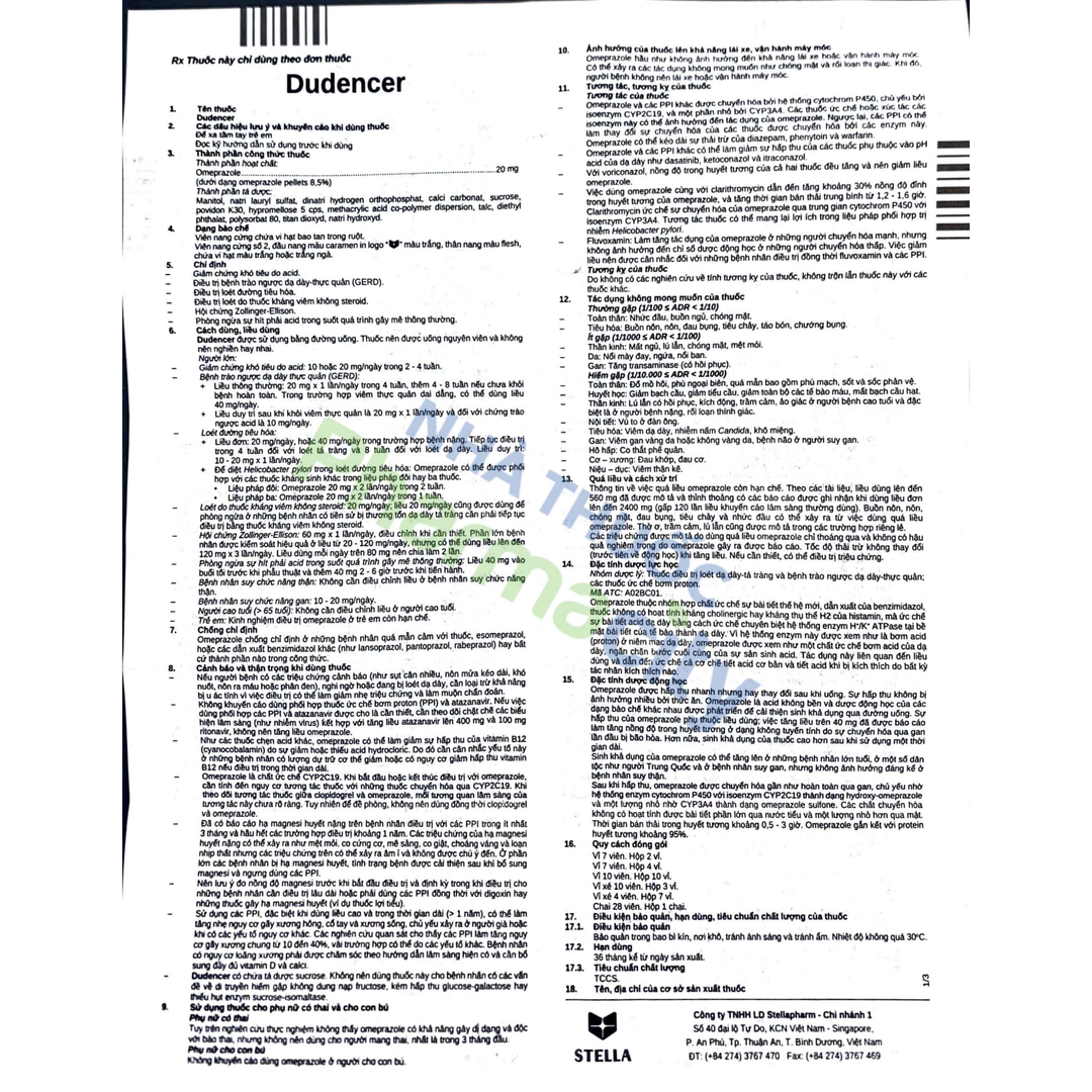 Dudencerr 20 của Công ty TNHH LD Stellapharm, thành phần chính là omeprazol (dưới dạng vi hạt omeprazol 8,5 %).