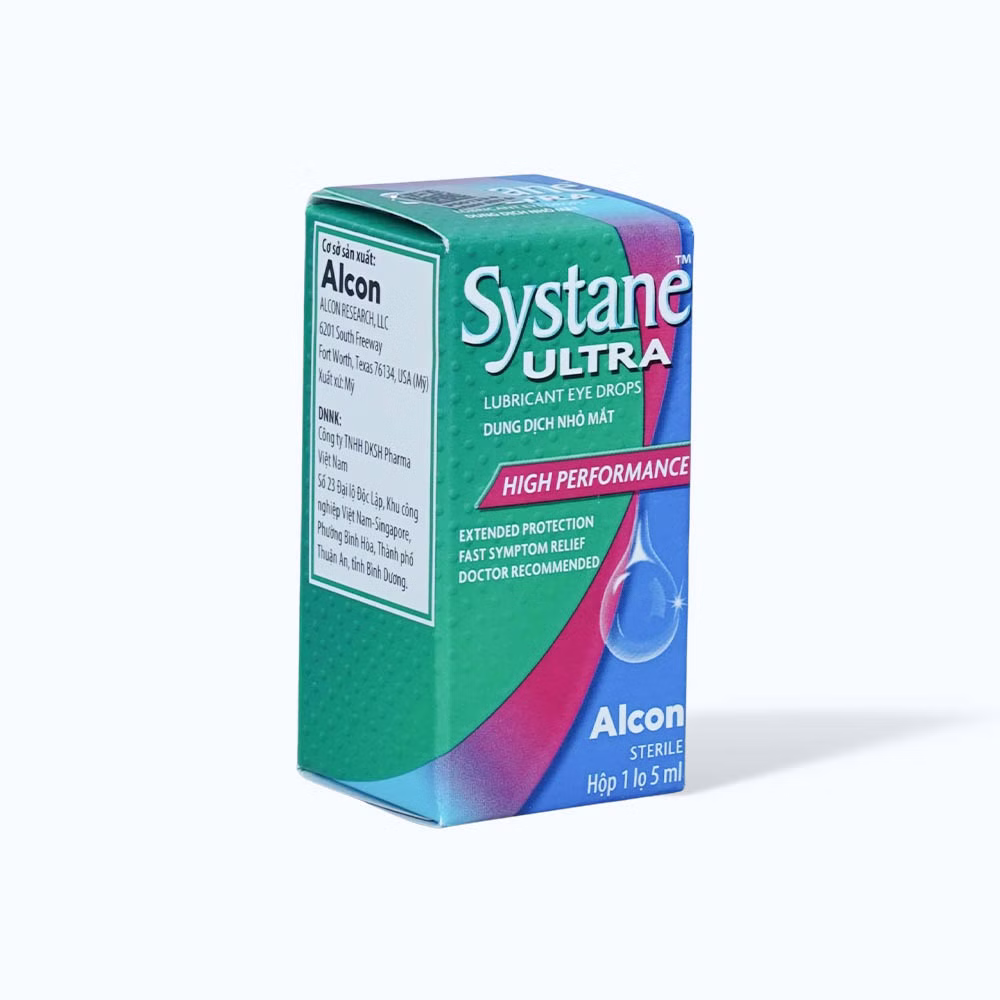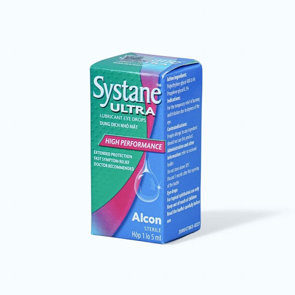 Thuốc nhỏ mắt Systane Ultra 5ml của Alcon Laboratories, inc., chứa dược chất chính gồm polyethylen glycol 400 và propylen glycol, được dùng để làm giảm tạm thời các chứng rát và kích ứng do khô mắt.