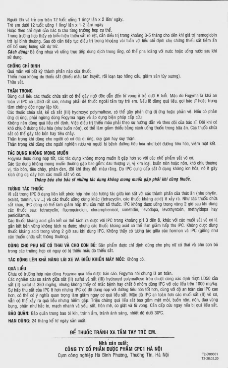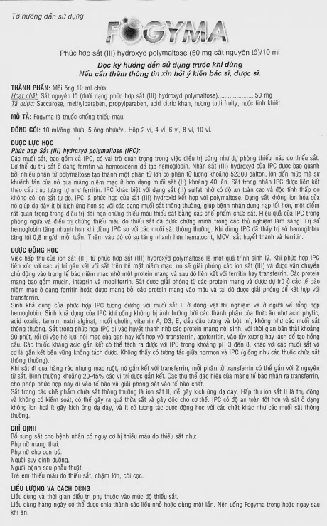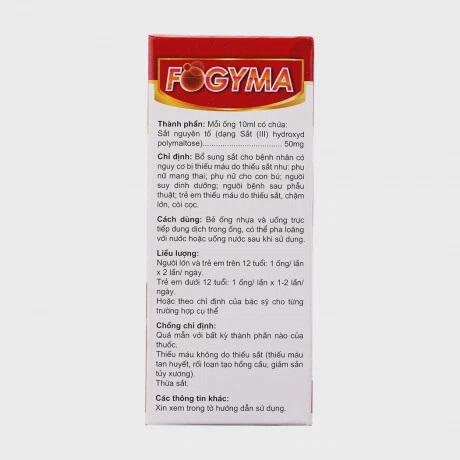 – Dùng quá liều các thuốc chứa sắt có thể gây ngộ độc dẫn đến tử vong ở trẻ dưới 6 tuổi. Mặc dùng Fogyma là khá an toàn vì IPC có LD50 rất cao, nhưng phải để thuốc ngoài tầm tay trẻ em. Nếu lỡ dùng quá liều, gọi bác sĩ hoặc trung tâm chống độc ngay lập tức.