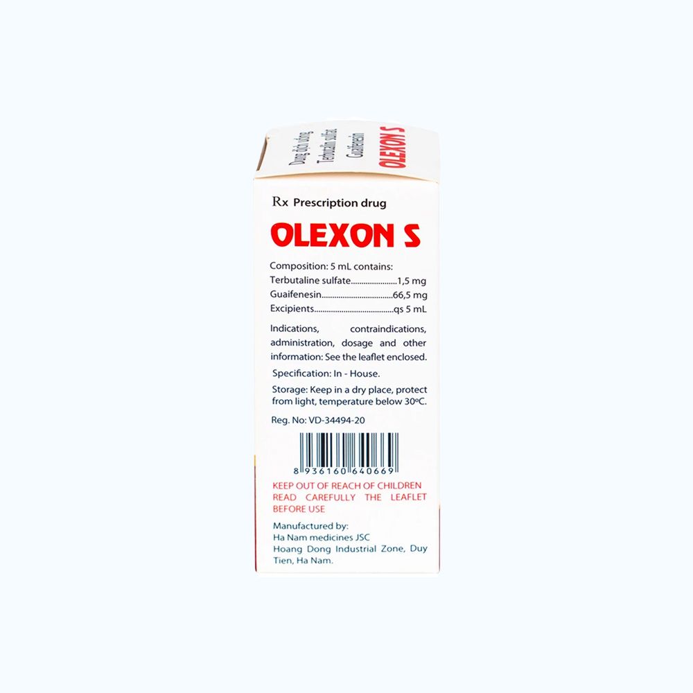 Dung dịch uống Olexon S là sản phẩm của Công ty Cổ phần Dược Vật tư Y tế Hà Nam có thành phần chính là Terbutalin sulfat, Guaifenesin dùng trong trường hợp ho có đờm, ho do hen phế quản, viêm phế quản, khí phế thủng và các bệnh phổi khác gây co thắt phế quản và tăng tiết.