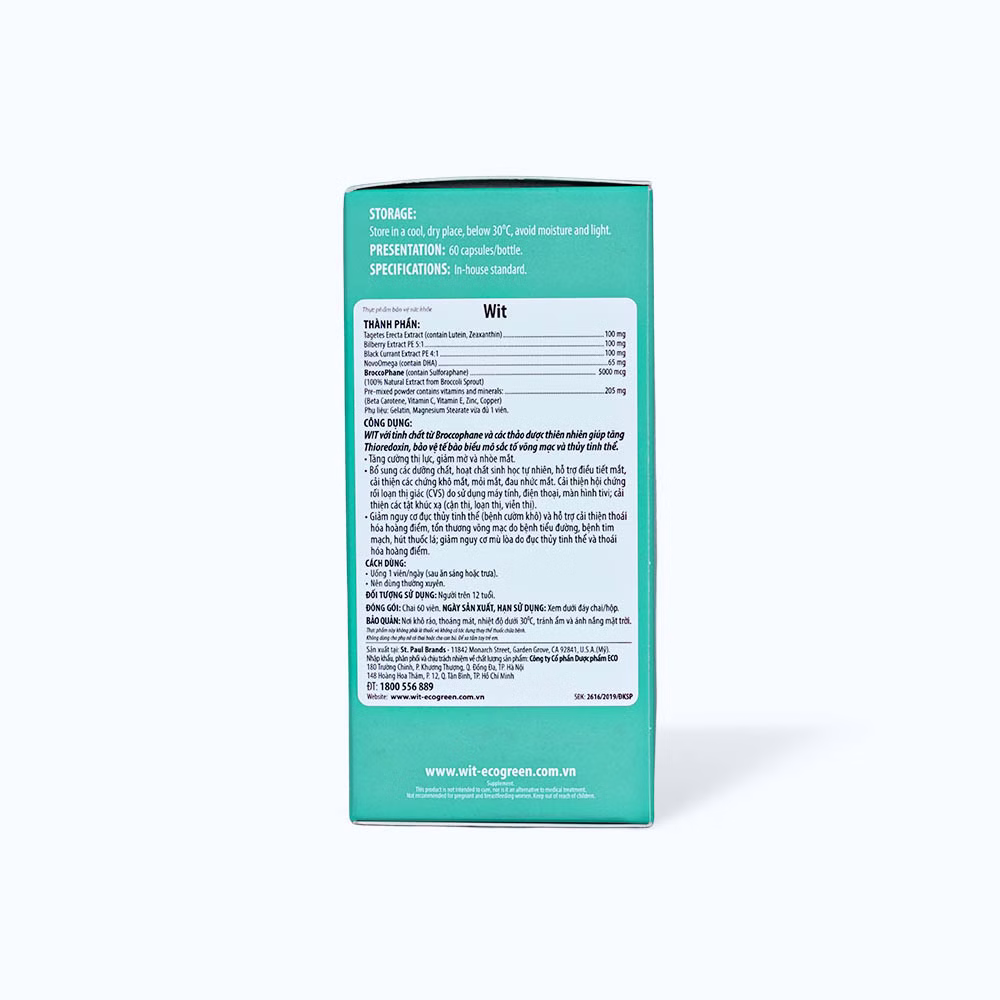 - Ecogreen WIT với tinh chất từ Broccophane và các thảo dược thiên nhiên giúp tăng Thioredoxin, bảo vệ tế bào biểu mô sắc tố võng mạc và thủy tinh thể.