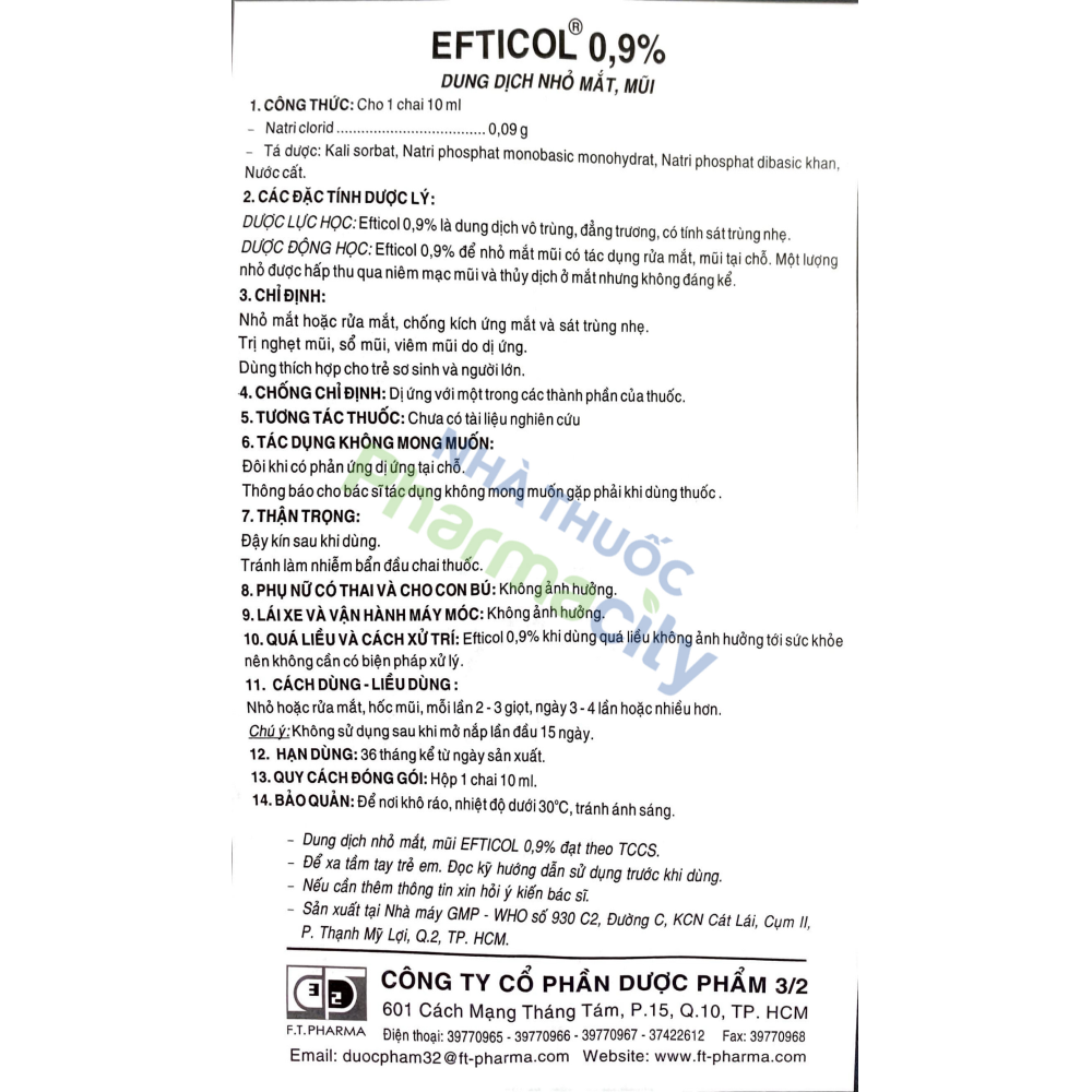Nước muối Efticol 0.9% là dung dịch vô trùng, đẳng trương, có tính sát trùng nhẹ, để nhỏ mắt mũi có tác dụng rửa mắt, mũi tại chỗ.
