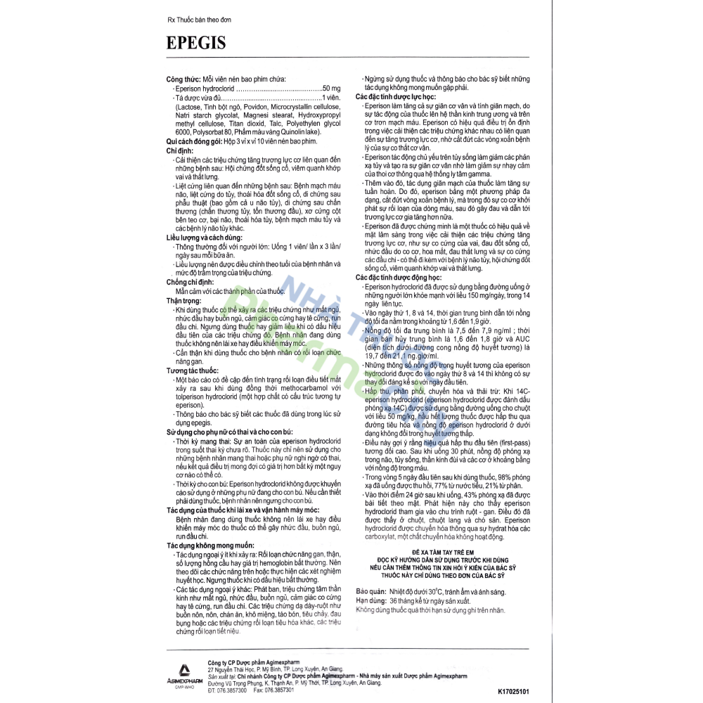 Viên nén Epegis 50mg là thuốc được chỉ định sử dụng phổ biến trong điều trị triệu chứng tăng trương lực cơ và liệt cứng gặp ở các bệnh lý thần kinh, cơ xương khớp.