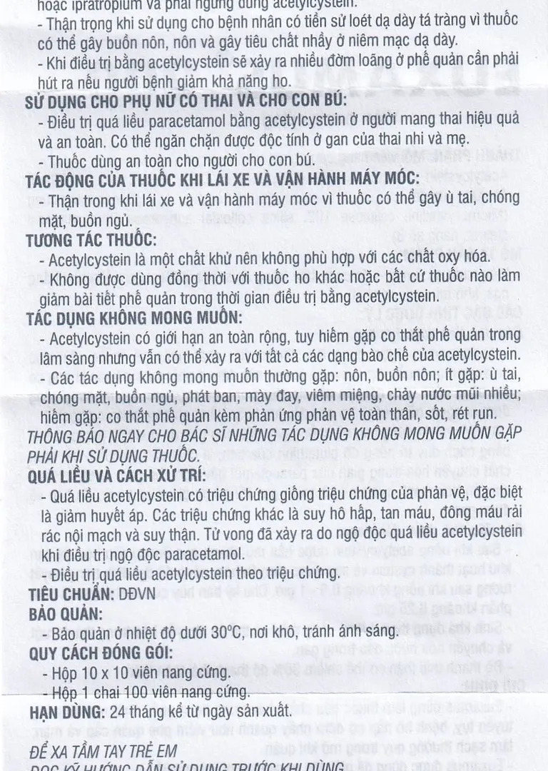 Không được dùng đồng thời với thuốc ho khác hoặc bất cứ thuốc nào làm giảm bài tiết phế quản trong thời gian điều trị bằng acetylcystein.