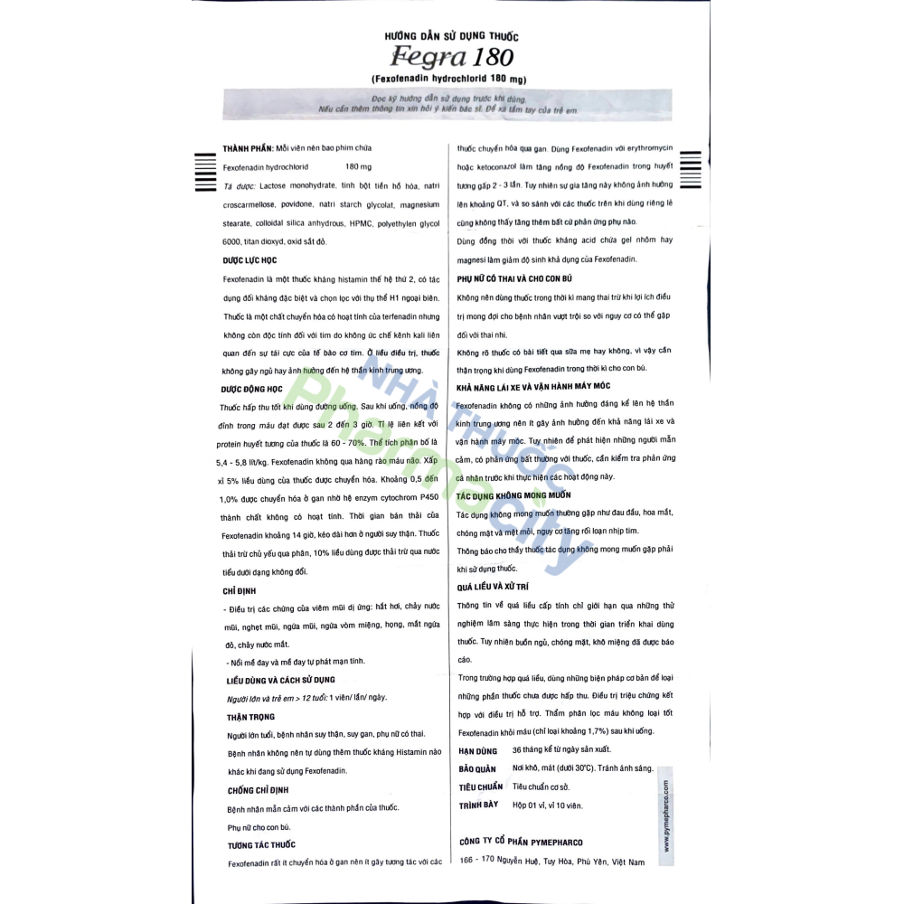 Viên nén Fegra 180mg là sản phẩm điều trị các chứng viêm mũi dị ứng và mề đay, được sản xuất bởi thương hiệu Pymepharco.